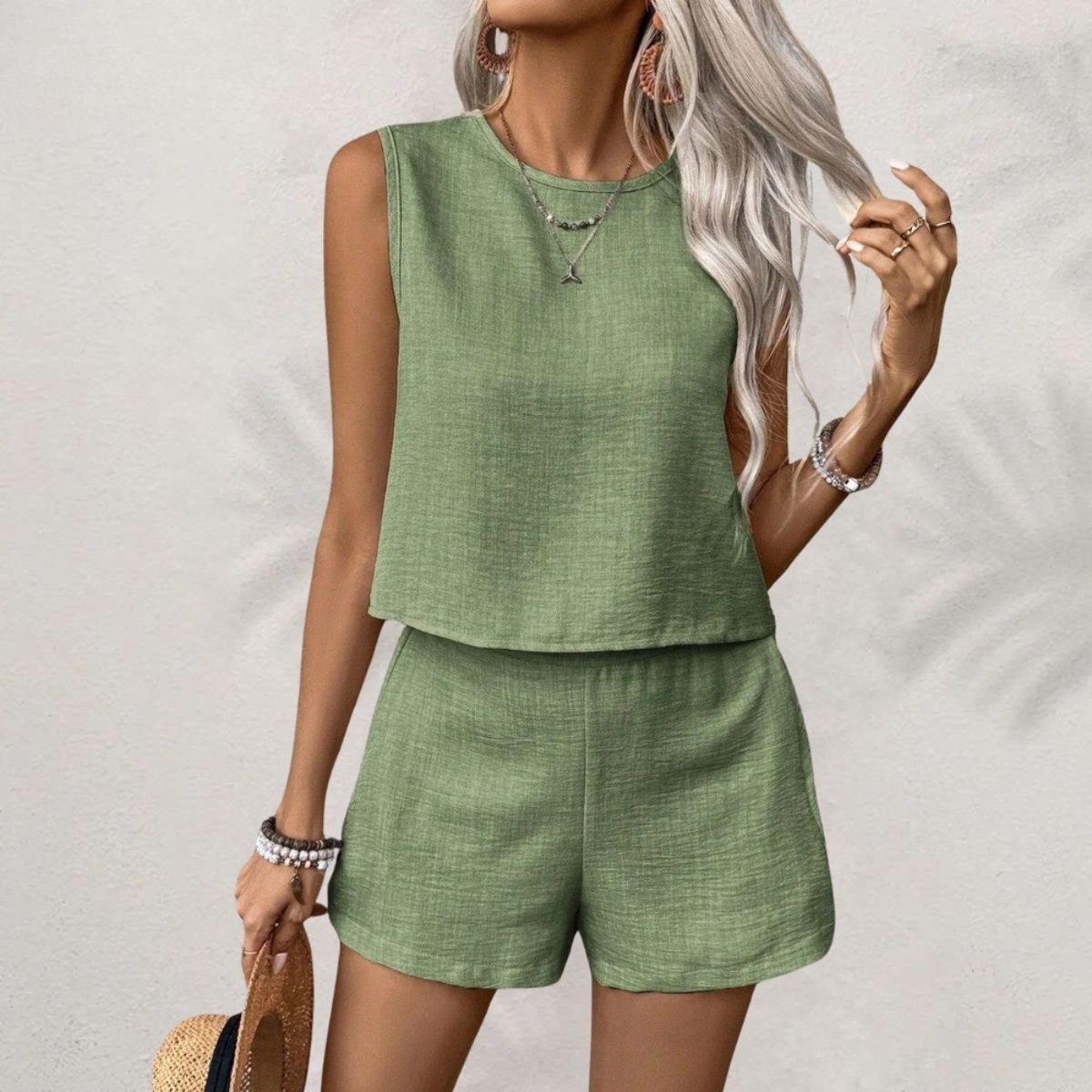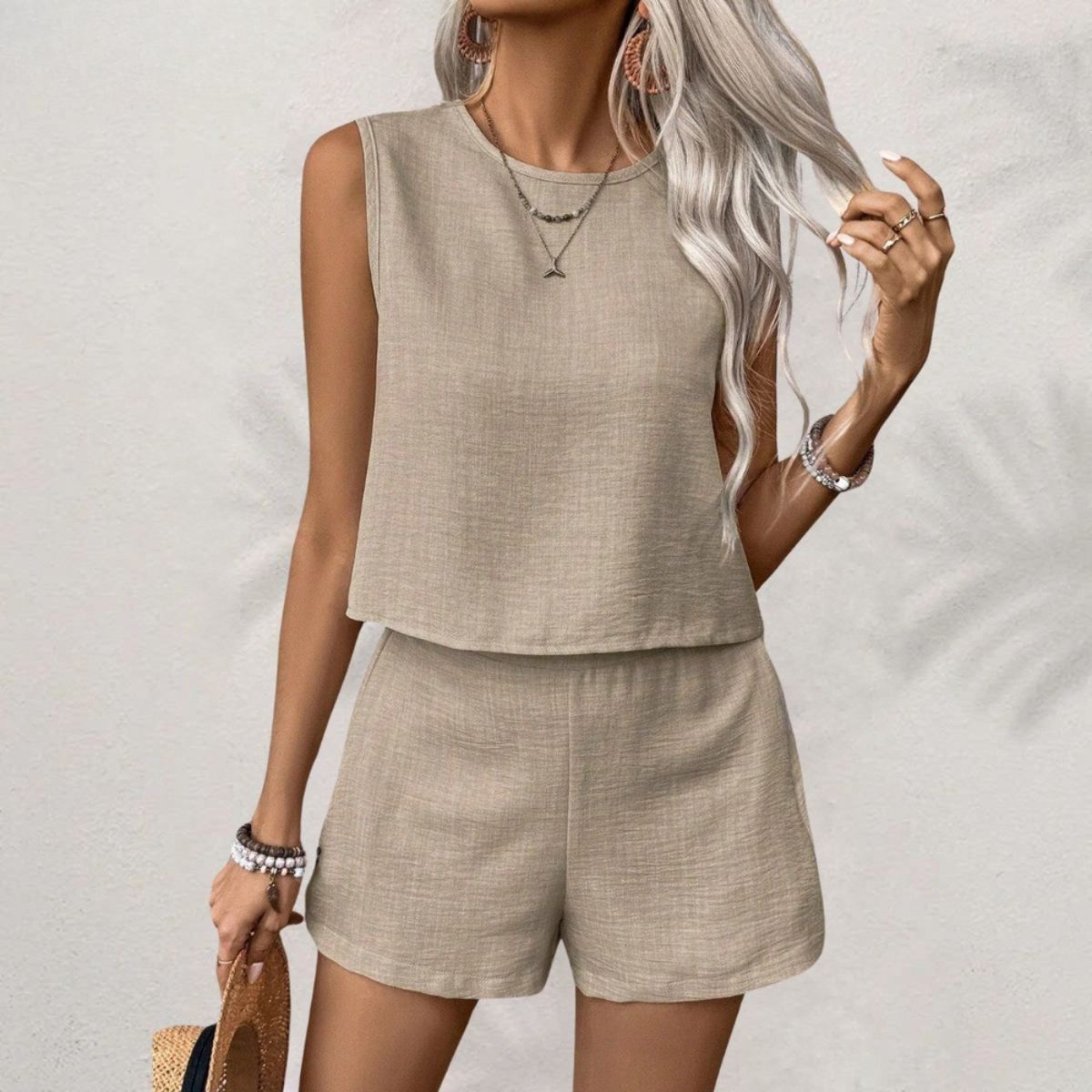 Embrace relaxed summer style with this complete two-piece set, featuring a sleeveless linen-blend top and tailored shorts. Designed for lightweight comfort and minimalist elegance, it’s perfect for everyday wear in warm weather.